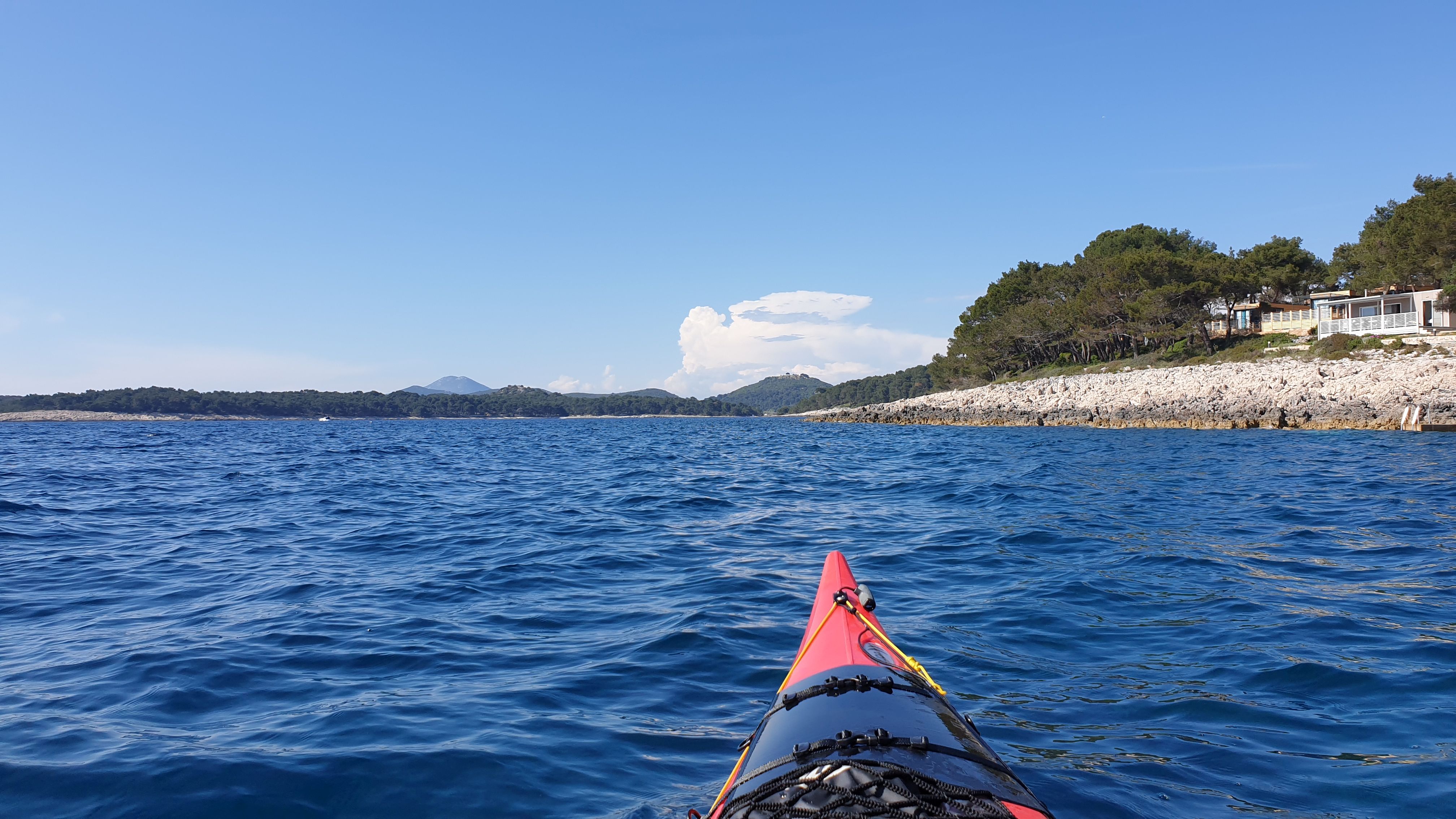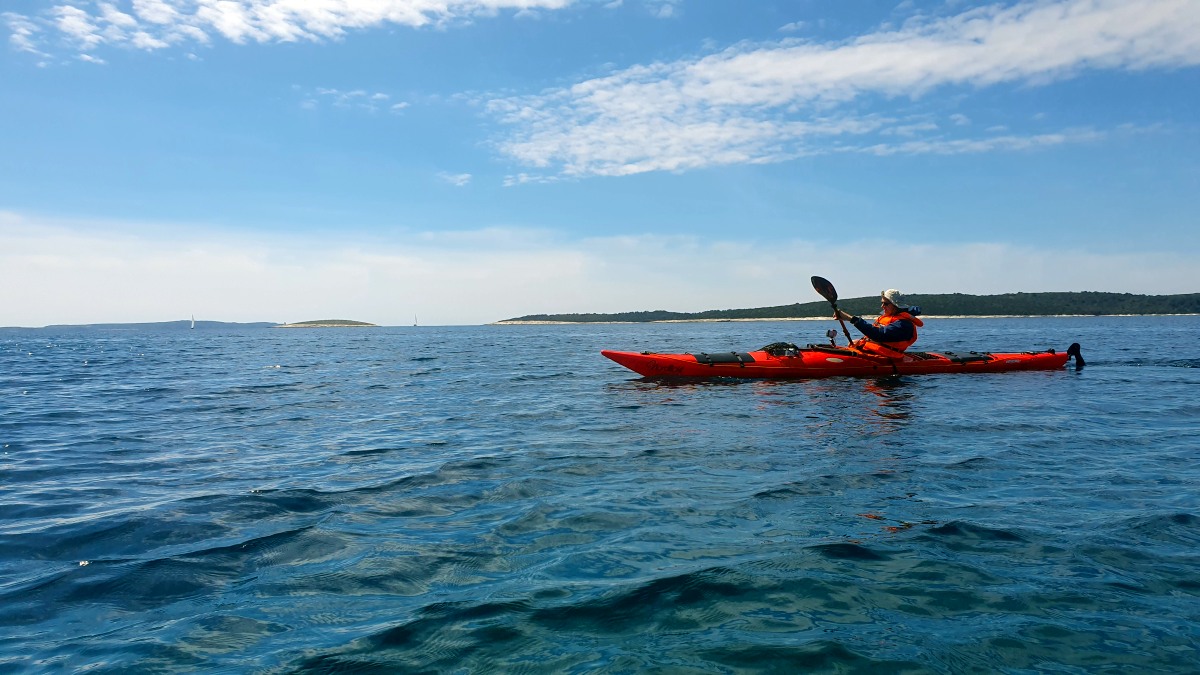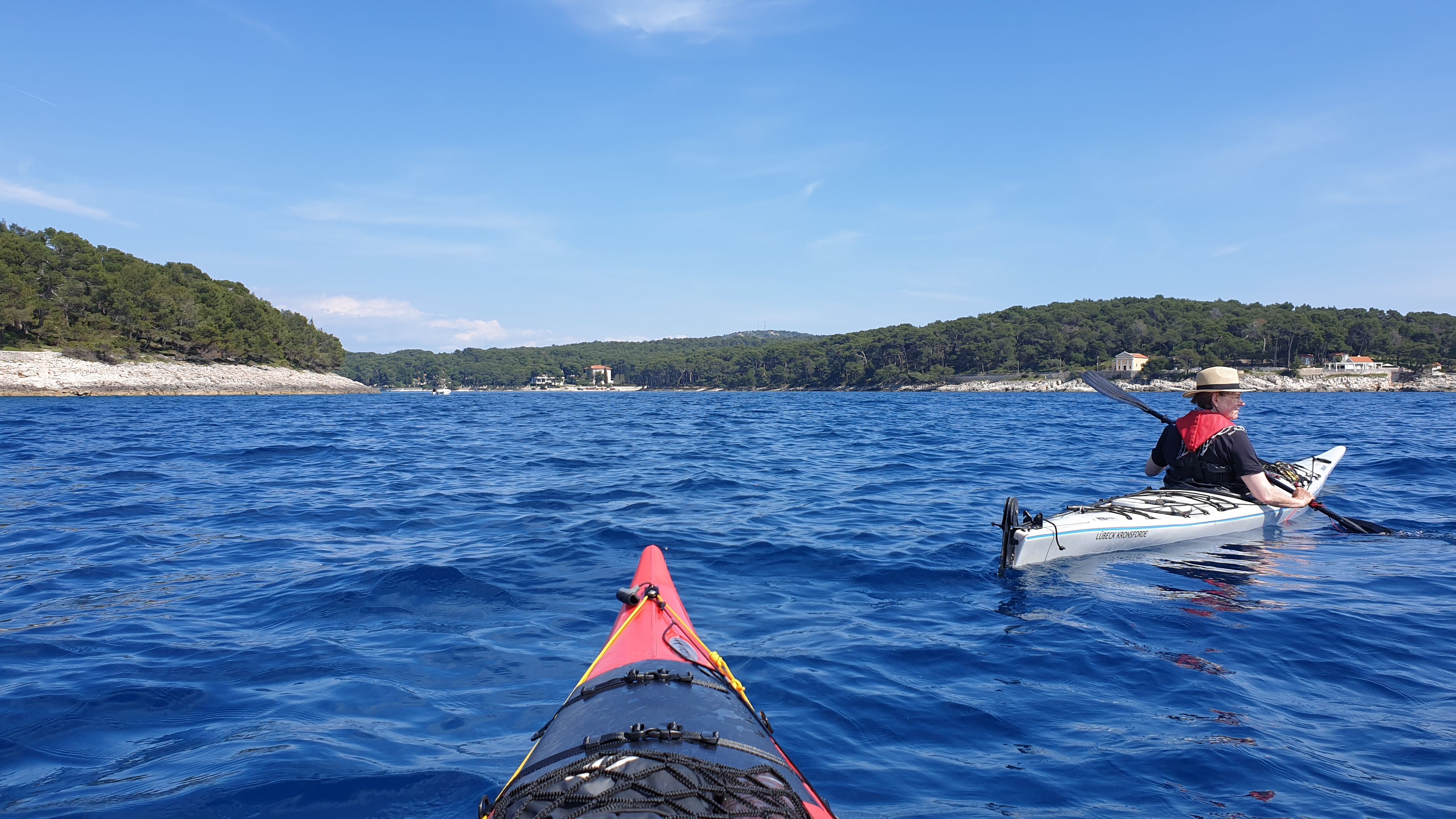 Gestern sind wir dort durchgepaddelt, nachdem wir eine größere Runde seewärts um die vor Mali Lošinj liegenden Inseln gedreht haben. Am Tag zuvor war das nicht möglich. Es zog während dieser ersten Paddeltour plötzlich Wind auf und die Wellen wurden - trotz der vorgelagerten schützenden Inseln - so hoch, dass wir wieder umdrehen mussten.