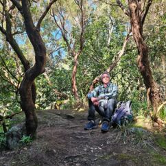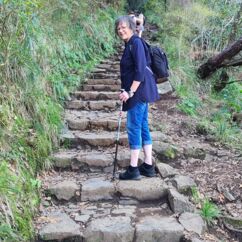 Letztendlich müssen wir zu Beginn und am Ende des Abstechers auf einem Pfad quer durchs bergige Gelände und auch noch einen breiten Wildbach überqueren und dabei über Felsbrocken laufen. Fritz findet das easy, ich nicht.