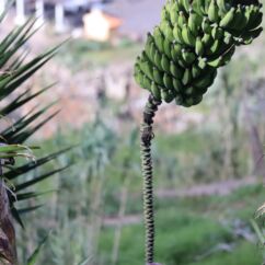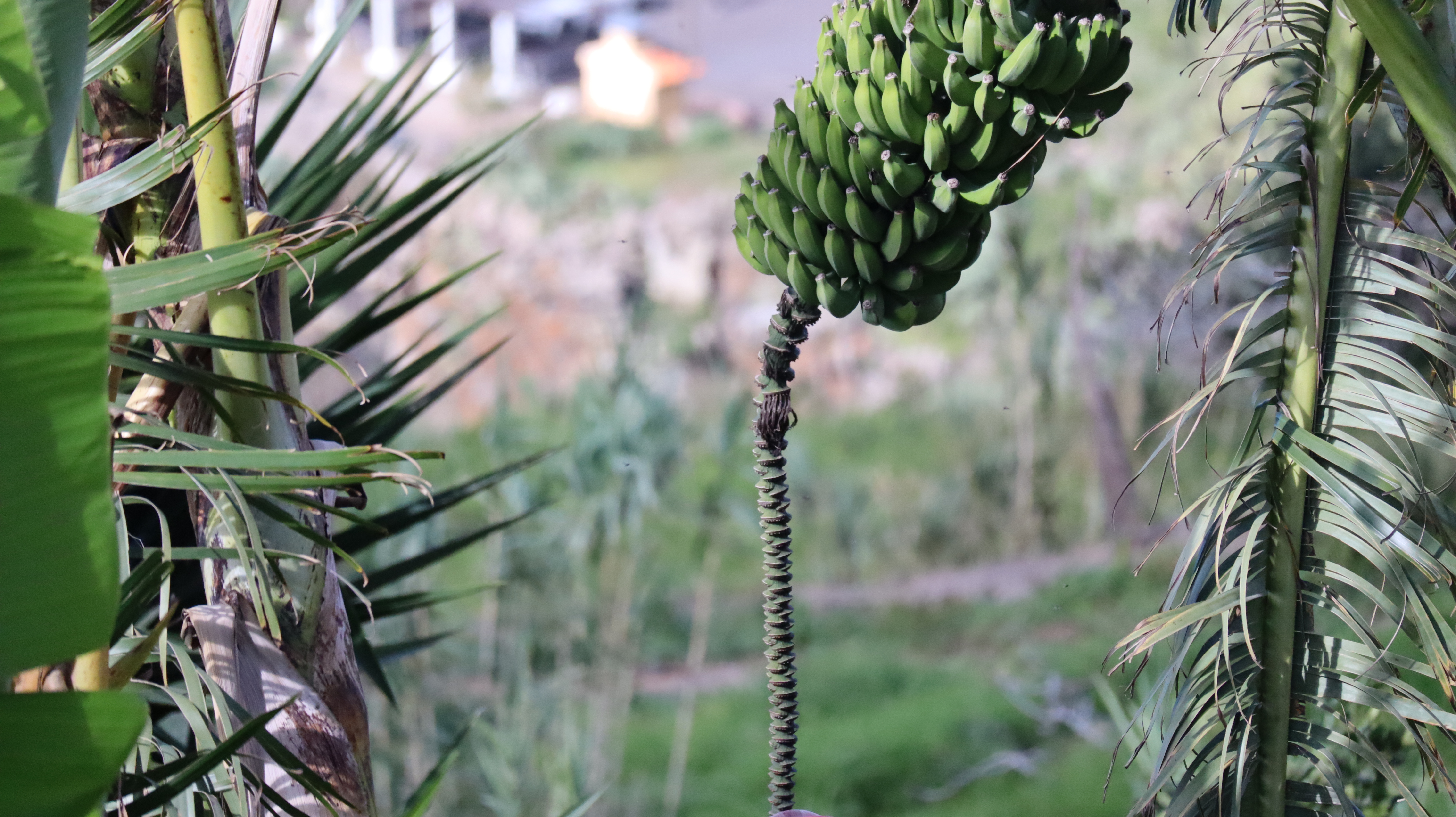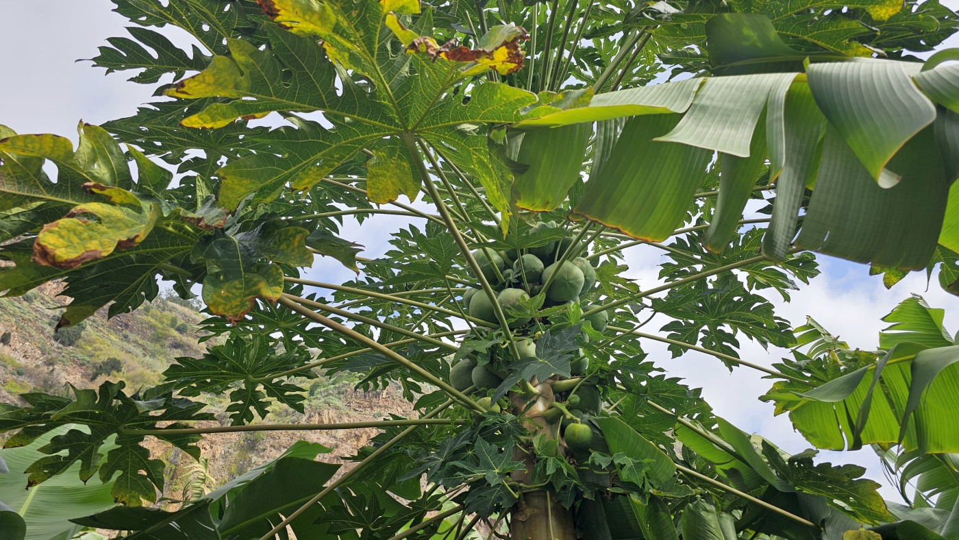 Die Berge um uns herum sind mit üppigster tropischer Vegetation ausgestattet. Es gibt kaum einen Fleck, der nicht bewachsen ist. Baumfarne, Bäume, Kakteen, Sukkulente, Palmen und Blumen soweit das Auge reicht. Überall wo es die Steigungen zulassen, haben die Menschen bepflanzte Terrassen angelegt mit Bananen, Wein, Getreide, Kartoffeln, Gemüse, Zitronen, Orangen, Avocados, Maracuja, Papaya, Zuckerrohr, Annonen, Drachenfrucht und mehr. Die meisten tropischen Früchte haben wir bereits probiert und ich habe für die Heimreise bereits einen stattlichen Vorrat an Samen gesichert. Besonders die saftigen Annonen mit einem ganz eigenen Geschmack haben es mir angetan, hoffentlich bekomme ich in Kronsforde ein Bäumchen herangezogen.