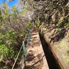 Unsere letzte Wanderung auf Madeira hat besonders lange steile Abschnitte. Die Levada Nova beginnt oberhalb Porto do Sol und verläuft in 400 Metern Höhe, meist am Berghang entlang. Bei dieser Wanderung kann man Höhenangst entwickeln. Steile Felswand - 70 cm Levadagraben - 70 cm Weg - Abgrund. An nur wenigen Stellen gibt es ein Geländer und manchmal ist der Weg halb weggebrochen.