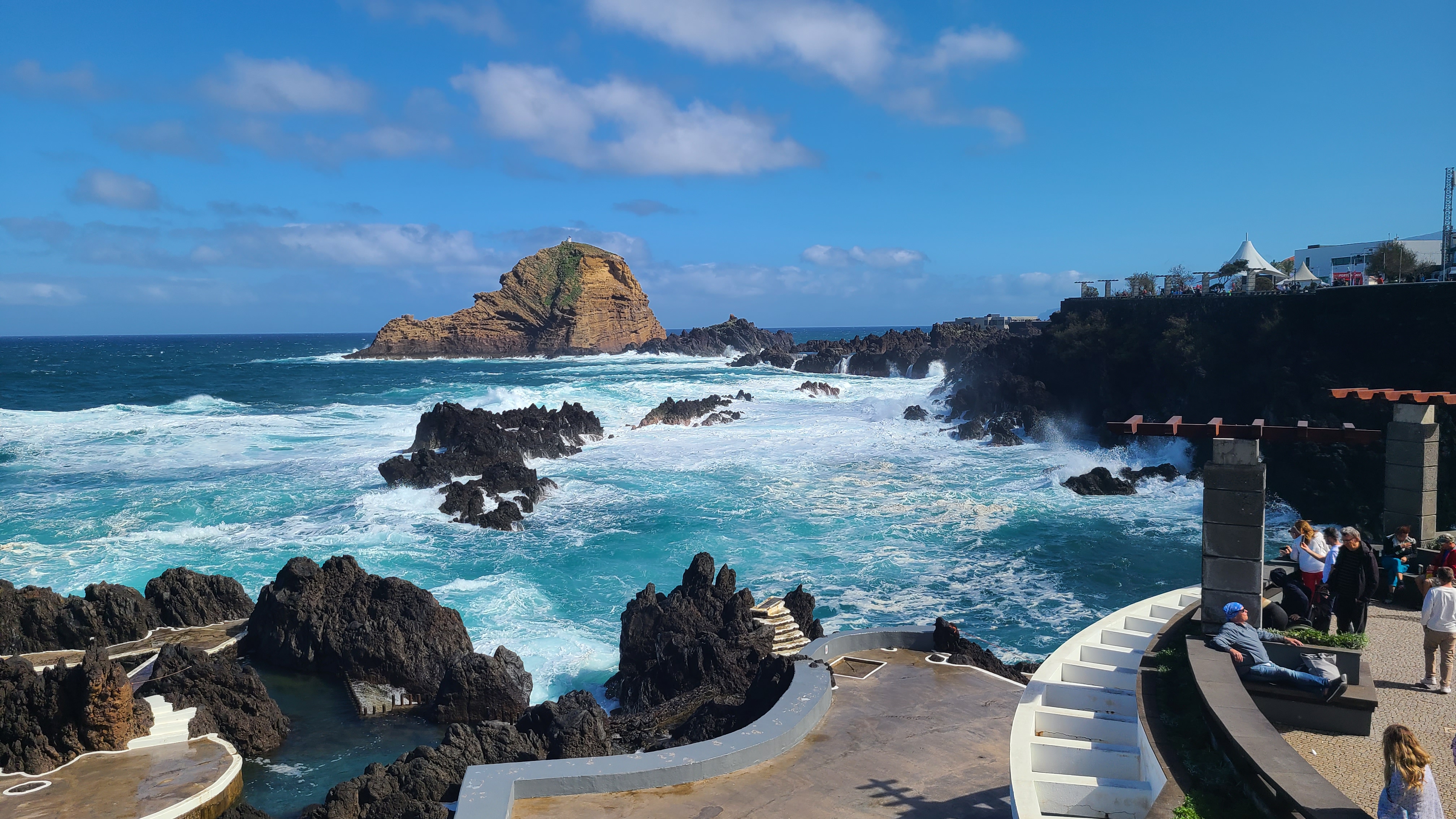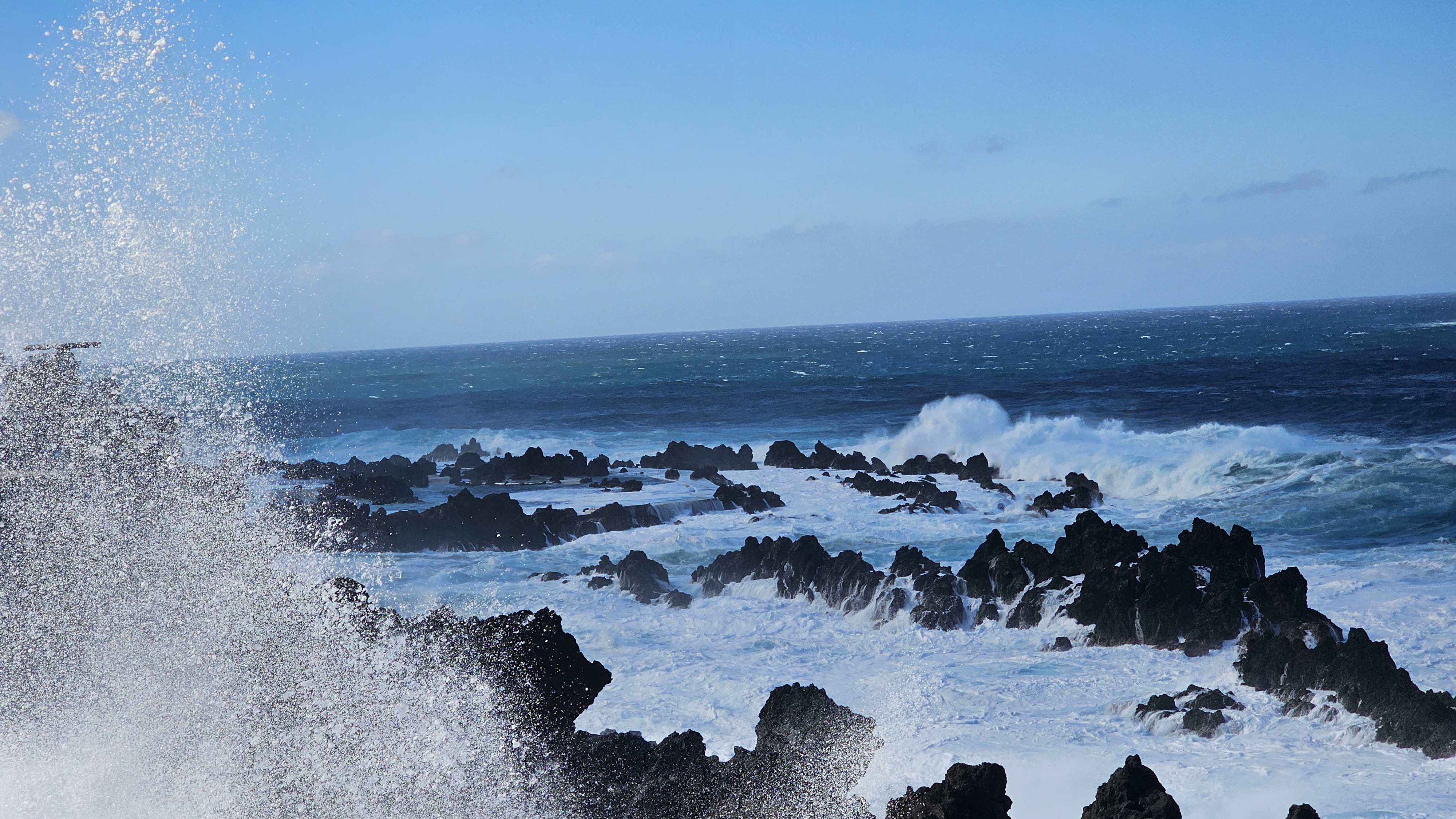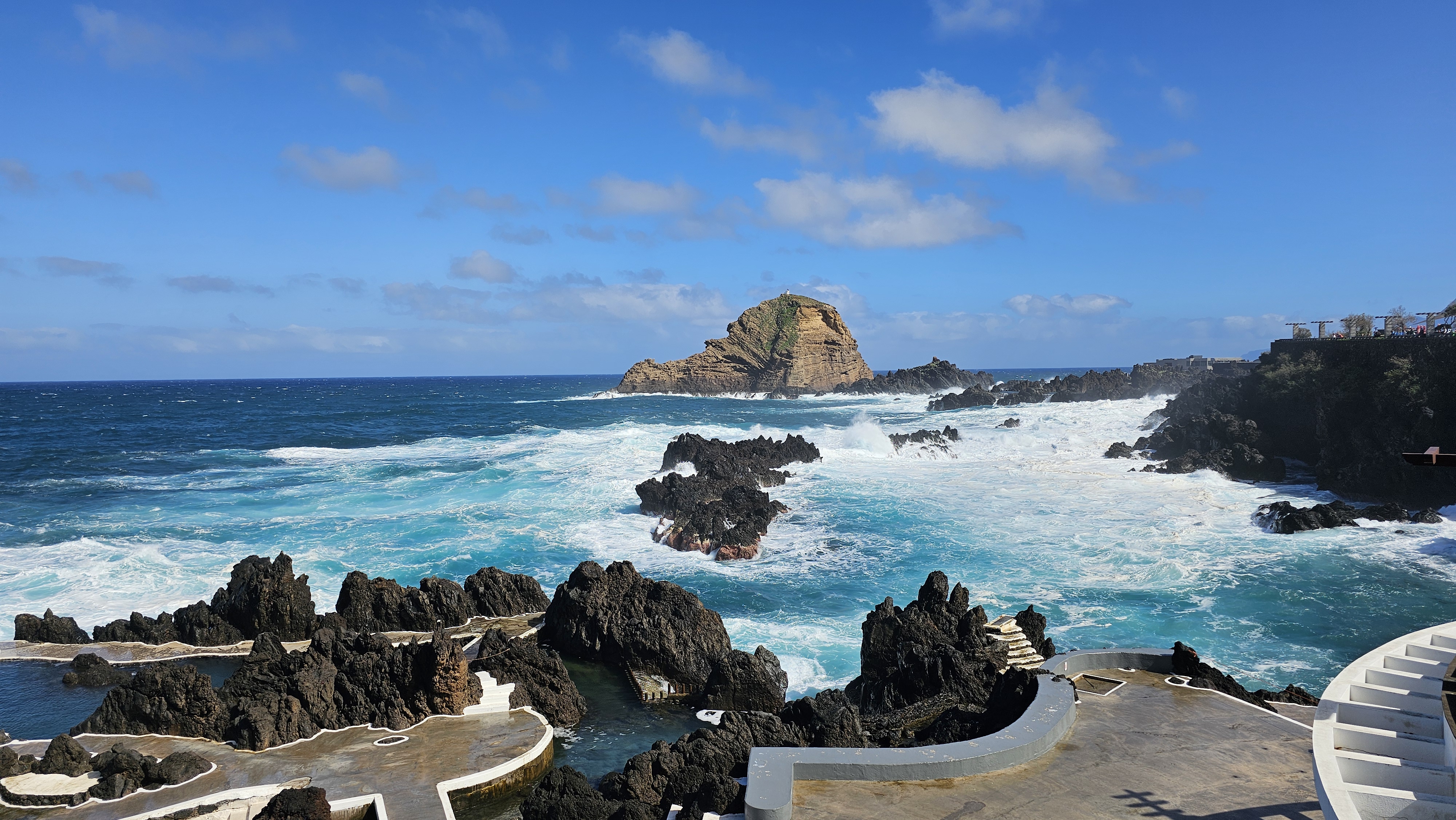Und dann kommt Porto Moniz! Ein Highlight mit Felsformationen vor der Küste, Badebecken, die mit Meerwasser überflutet werden und tosenden Wellen, die beim Zurückfluten aufeinandertreffen und phantastische Wasser- und Gischtfontänen zaubern. Es fällt uns schwer, den Blick davon zu lösen.