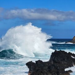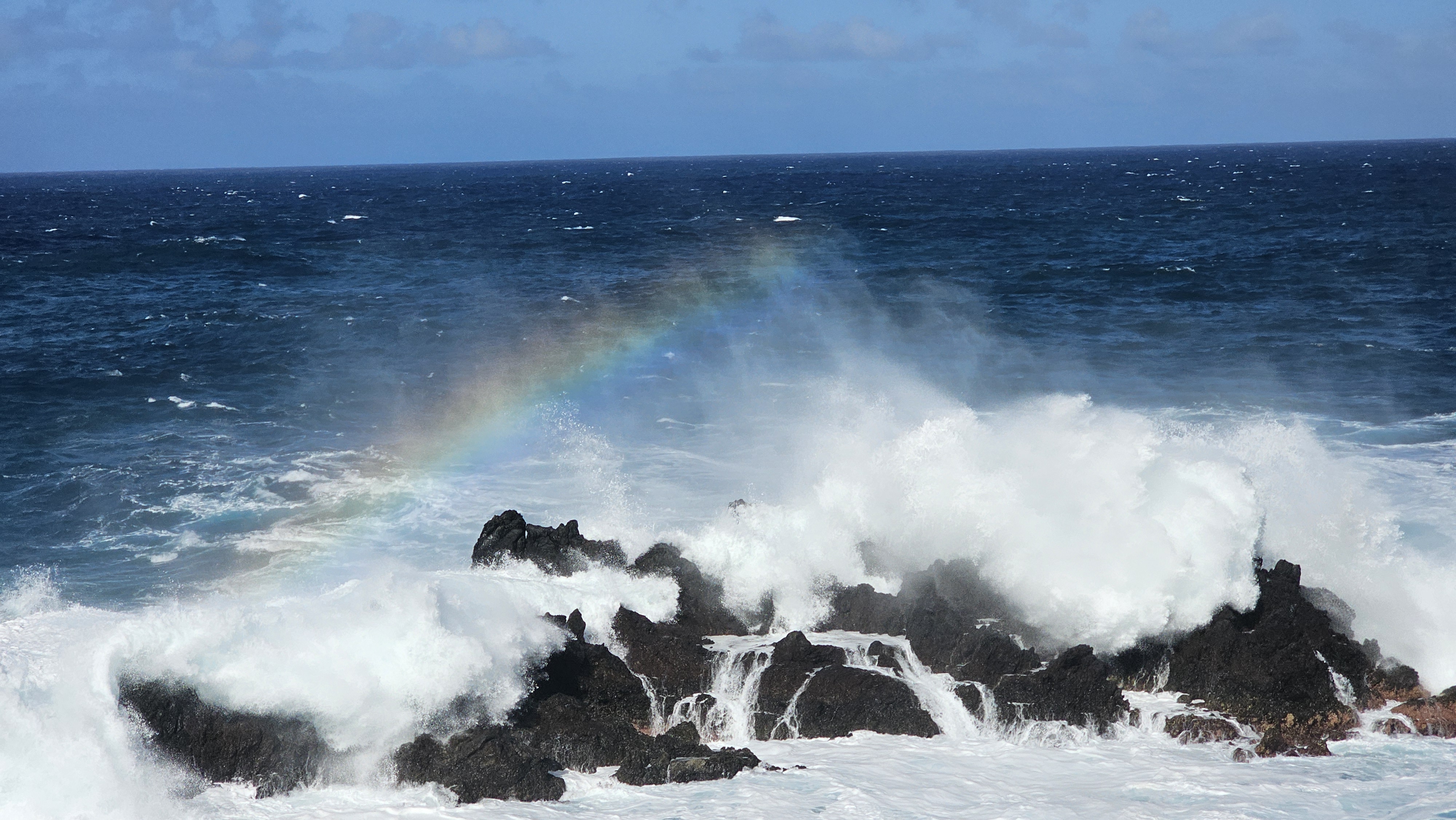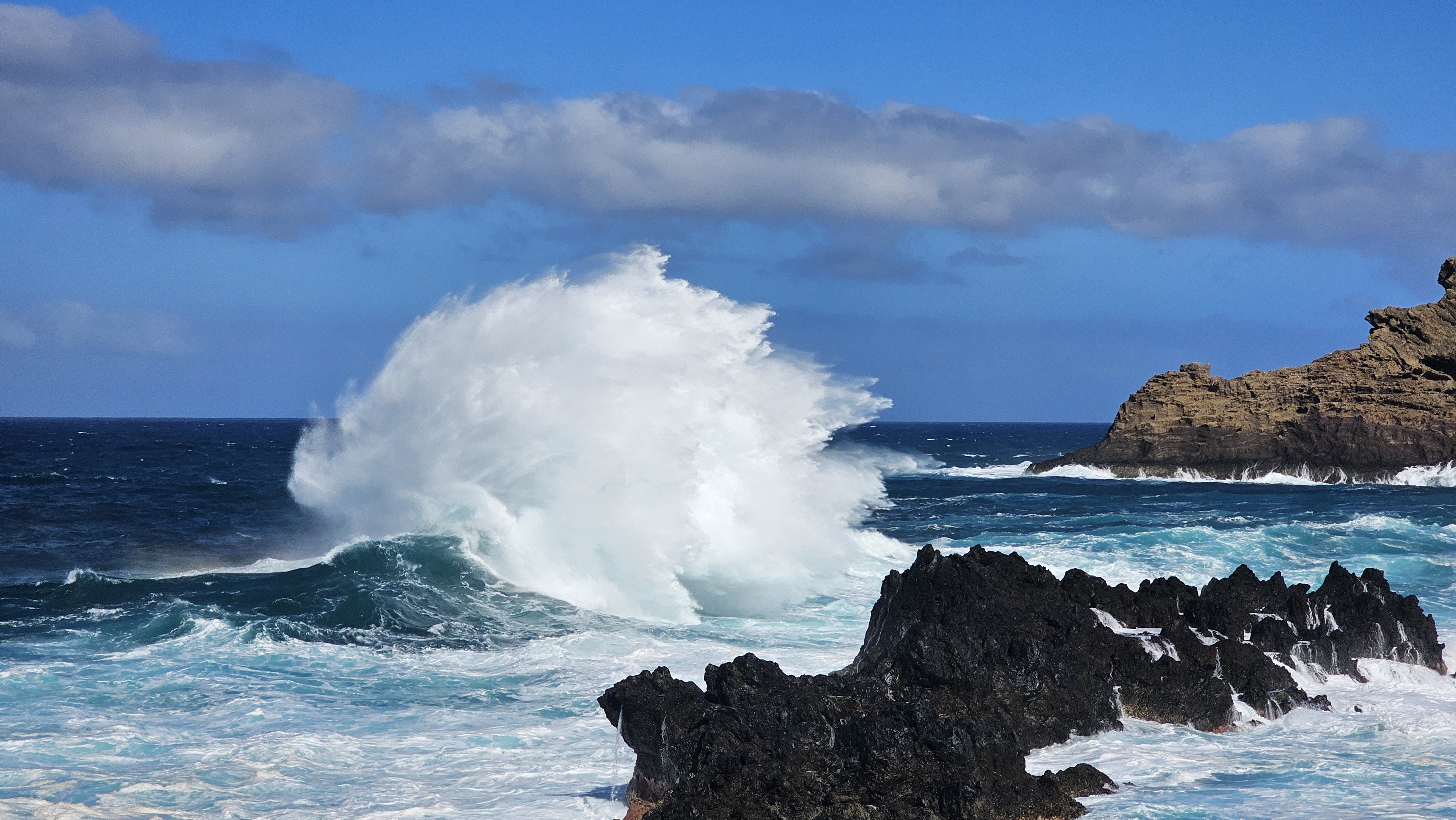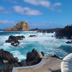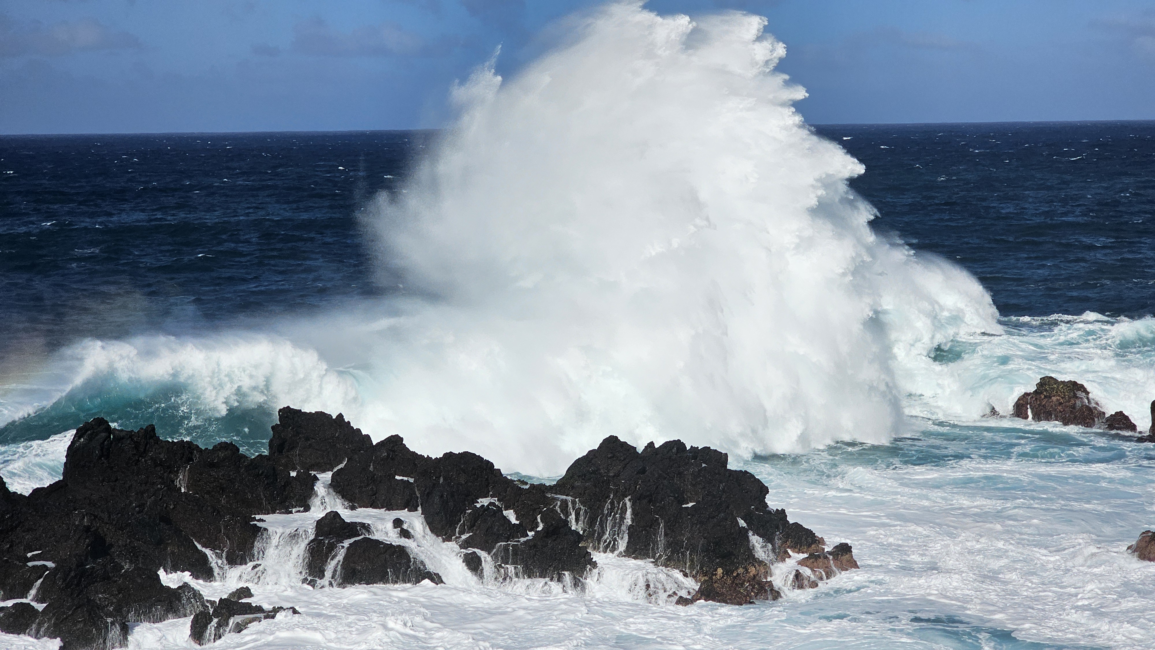 Und dann kommt Porto Moniz! Ein Highlight mit Felsformationen vor der Küste, Badebecken, die mit Meerwasser überflutet werden und tosenden Wellen, die beim Zurückfluten aufeinandertreffen und phantastische Wasser- und Gischtfontänen zaubern. Es fällt uns schwer, den Blick davon zu lösen.