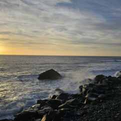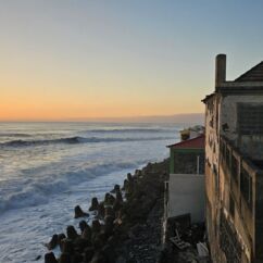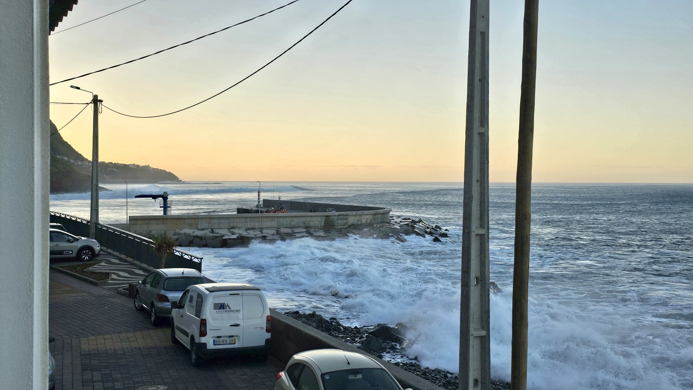 Unser Tag beginnt mit einem Frühstück auf der Terrasse und einem ungewöhnlichen Blick auf den Horizont. Wo normalerweise eine gerade Linie Wasser und Himmel trennt, ist heute eine unruhige wellige Linie. Dort draußen scheinen heftige Atlantikwellen zu toben.