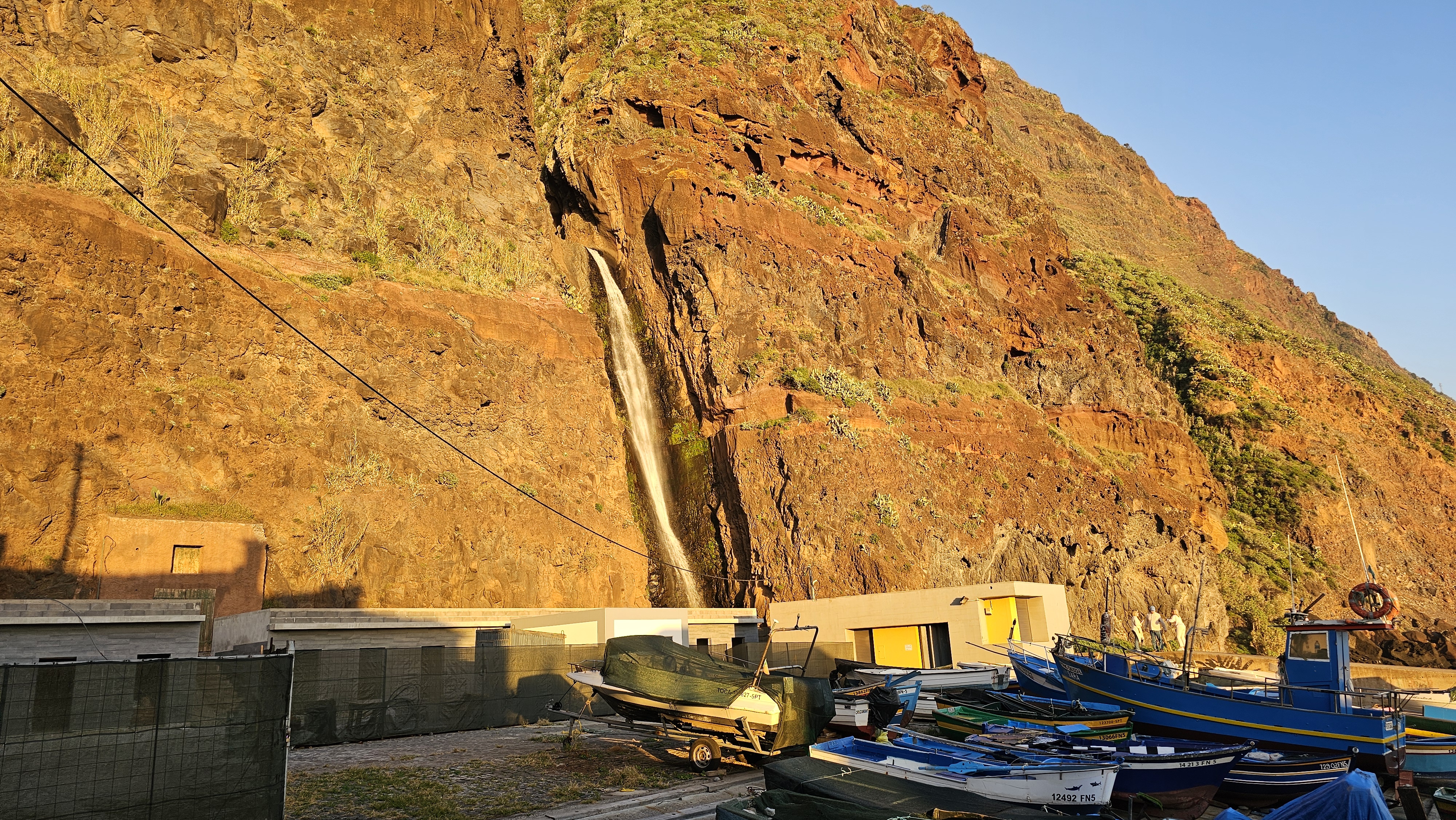 Wir erkunden die nähere Umgebung und landen gegen Mittag im Nachbarort Madalena de Mar. Der Ort ist auf den ersten Blick so ursprünglich wie Paul do Mar, nur wenige Neubauten. Doch hier treffen wir beim Mittagessen auf einige Touristen der First Class. Sportwagen, junge Frau mit altem Kerl, richtig schöne Mode, höhere Preise für unser Mittagessen, aber trotzdem noch alles sehr nett.