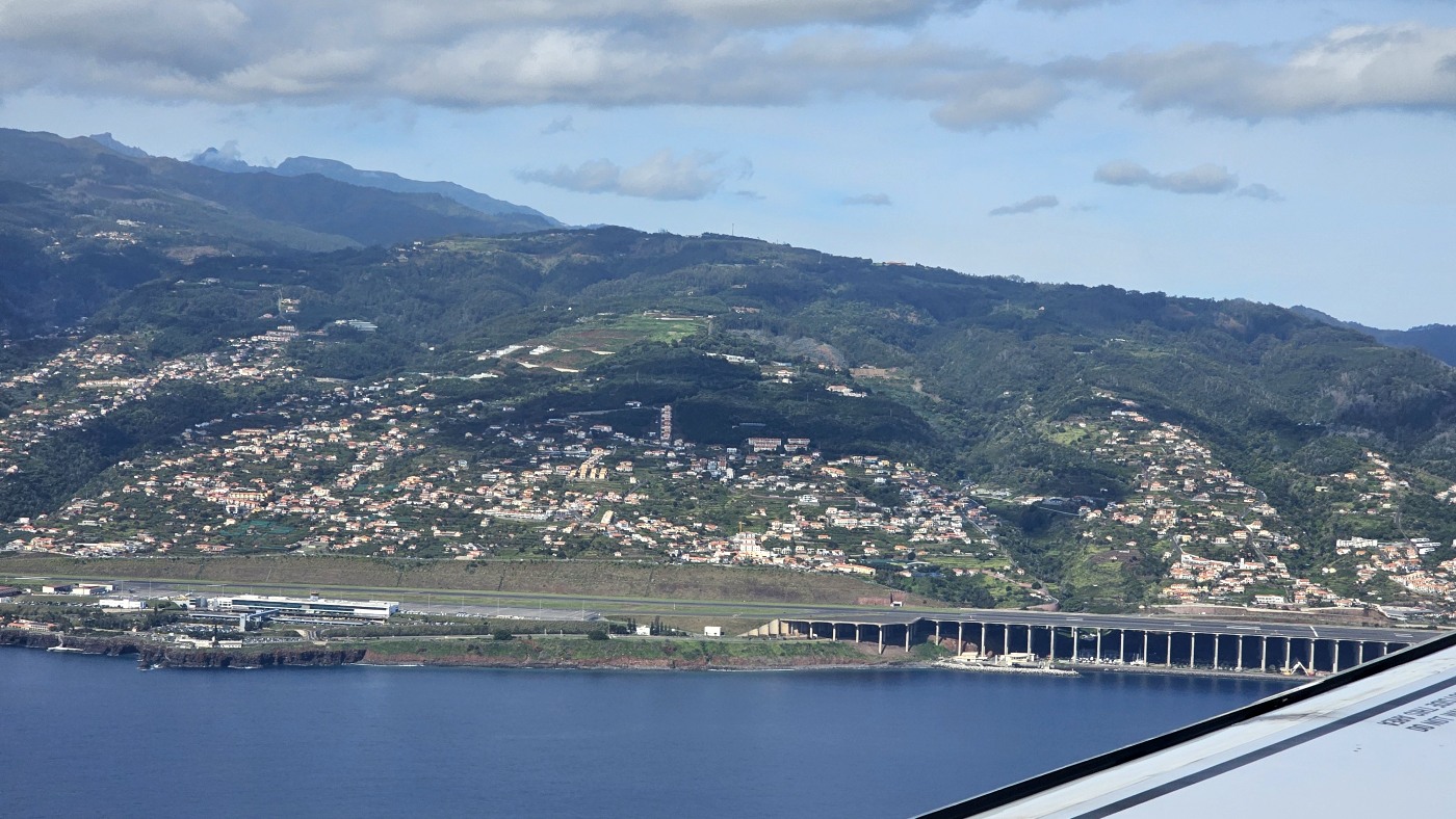 Gegen 8.30 Uhr startet der Condor-Flieger in den grauen Himmel - unser erster Flug seit Corona. Es dauert eine ganze Weile, bis wir über den Wolken sind und endlich Sonnenschein erreichen. Viereinhalb Stunden später kommt die Stelzen-Landebahn Madeiras in Sicht. Die Landung ist für Piloten wohl eine besondere Herausforderung.