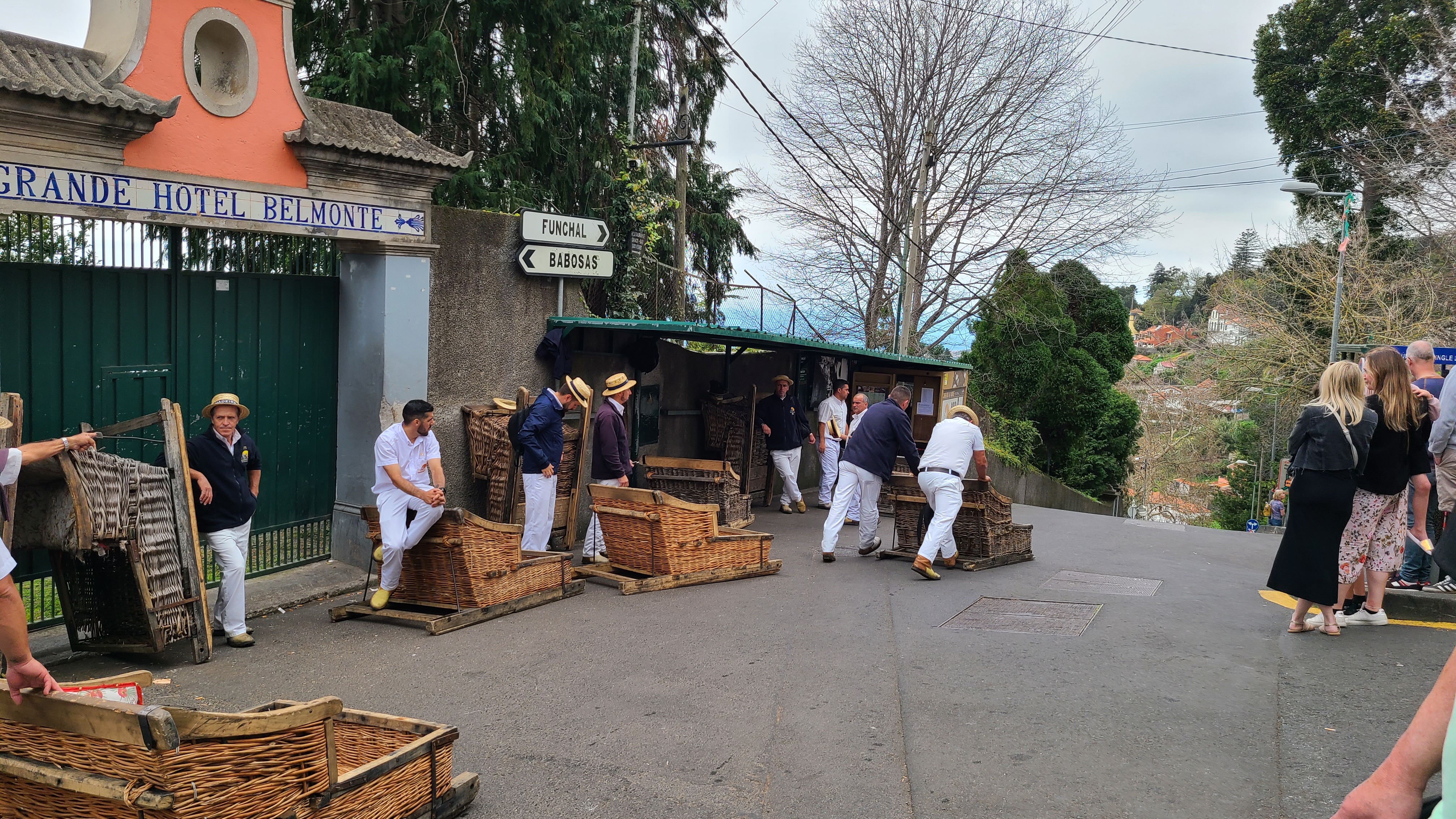 Anschließend schauen wir uns noch die traditionionellen Korbschlittenfahrten an. Was Mitte des 19ten Jahrhunderts als schnelles Transportmittel eingeführt wurde, ist heute ein heftiger Touri-Rummel. Zwei traditionell gekleidete Schlittenführer rasen mit Holzschlitten und zwei Touristen mit bis zu 48 km/h zwei Kilometer die Straßen abwärts. Allein die Gummisohlen ihrer Stiefel sind die Bremsen. Ich finde, die Schlittenführer schauen alles andere als glücklich aus.