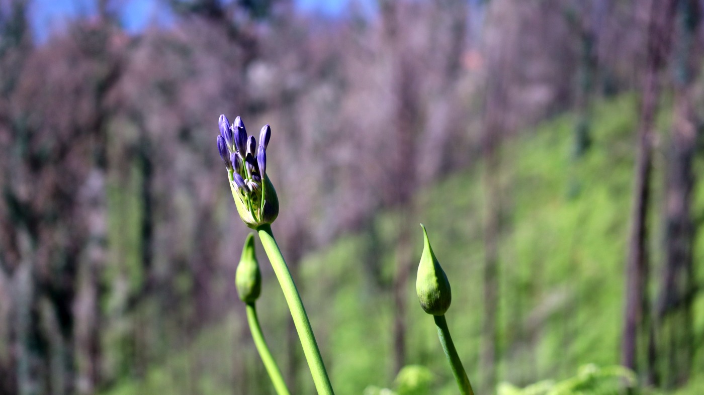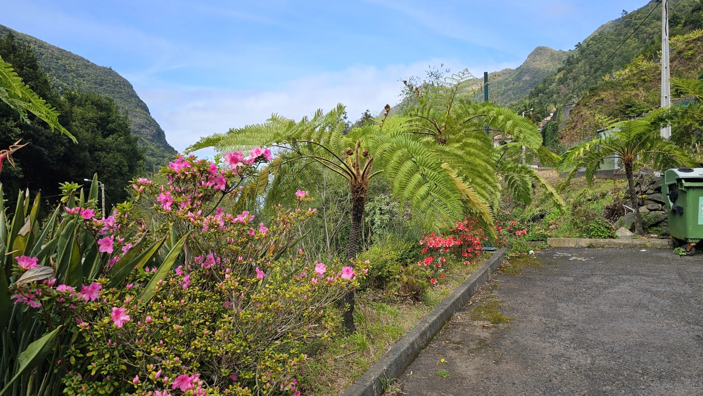 Wir laufen heute eine neue Levadaroute durch die mit Farnen bedeckten Berge und den verkohlten Baumstämmen, die wir bereits bei unseren ersten Ausflügen gesehen hatten. Der Weg dorthin ist wieder voll explodierender Vegetation, auch mit uns noch unbekannten Blumen, die nun im Frühjahr ihre Knospen öffnen. Ein Berliner Paar erzählt uns, dass der Brand erst im letzten Oktober gewütet und viele Berghänge betroffen hatte. Angesichts dieser kurzen Zeit hat das Grün schon wieder heftig an Überhand gewonnen.
