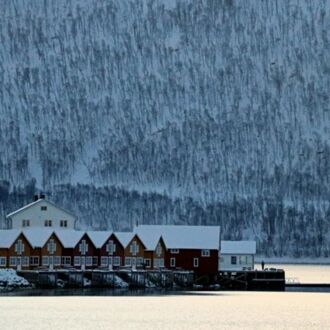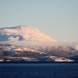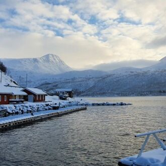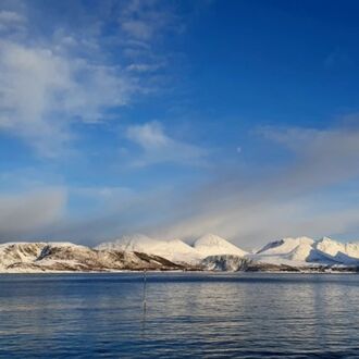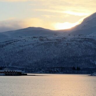 Die Farbe des Himmels wechselt gerade von Schwarz zu Blau und die Lichter Tromsøs leuchten in der Dunkelheit wie ein Schmuckstück, als wir um 8.00 Uhr Richtung Skjervøy starten.