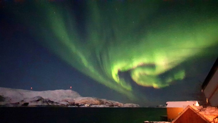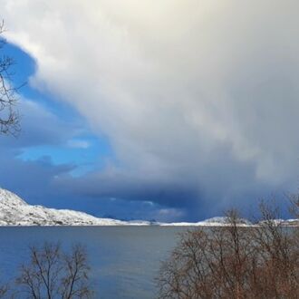 Die Rücktour im Bus zieht sich leider sehr in die Länge. Durch eine gesperrte Straße muss die Route geändert werden und wir sind erst um 19.30 Uhr wieder in Tromsø. Unsere anschließende Autofahrt zur Hütte ist abenteuerlich: Heftige Sturmböen, peitschender Schneeregen, halb aufgetaute Eisfelder auf der Fahrbahn, teils tiefe Wasserfurten in den Fahrbahnsenken. Auf der Brücke über den Fjord, der Tromsø teilt, wird bei Windstärke 10 ein Auto mit Anhänger auf unsere Gegenfahrbahn gedrückt. Kurzum: Wir sind froh, als wir unsere kuschelige Hütte mit Ofen erreichen, sammeln schnell noch den Mülleimer auf, der nun schon zum zweiten Mal in den Garten geweht wurde und begeben uns glücklich, aber todmüde in unsere kuschelige Koje.