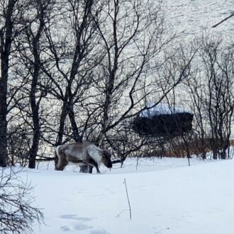 Vor unserem geistigen Auge hatten wir uns in einem Schlitten mit Rentier durch die verschneite sonnige Landschaft fahren gesehen. Die Realität im Sami-Touri-Camp sieht anders aus: Ein junger Same führt in dem eingezäunten Gelände das erste Rentier am Zaumzeug, ganz viele Schlitten nebst Zugtieren sind dahinter in einer Reihe miteinander verbunden und er geht mit der Touristenschlange hinter sich einmal um die große Koppel. Ähnlich wie Ponyreiten auf dem Jahrmarkt, nur dass die Runde viel größer ist und die schnelle Trabrunde ausfällt. Anschließend dürfen wir wie im Streichelzoo die Rentiere füttern und bekommen selbst eine traditionelle Rentier-Gulaschsuppe. Naja…