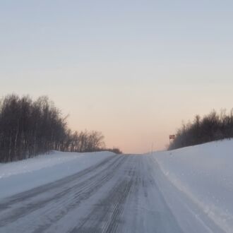 Ab 9.00 Uhr zeigt sich langsam die Sonne und taucht die Landschaft in helle Pastellfarben. Die Straßen sind meist schnurgerade, wellig wie ein Waschbrett und rechts und links von Wald gesäumt. Der geradeaus gerichtete Blick schaut in einen Himmel, dessen Hellblau in ein Hellgelb und schließlich Hellrosa übergeht.