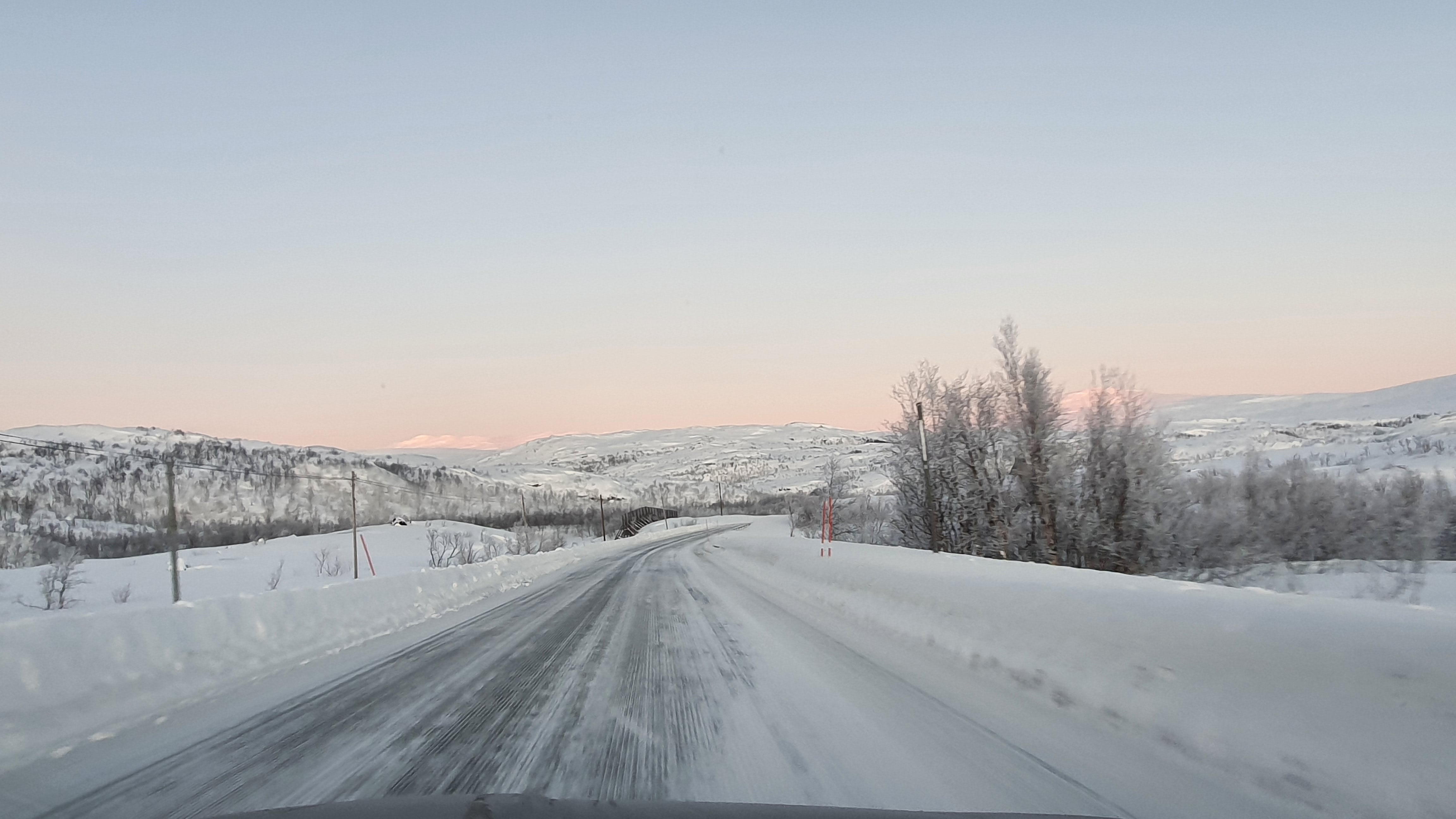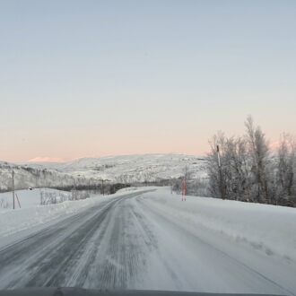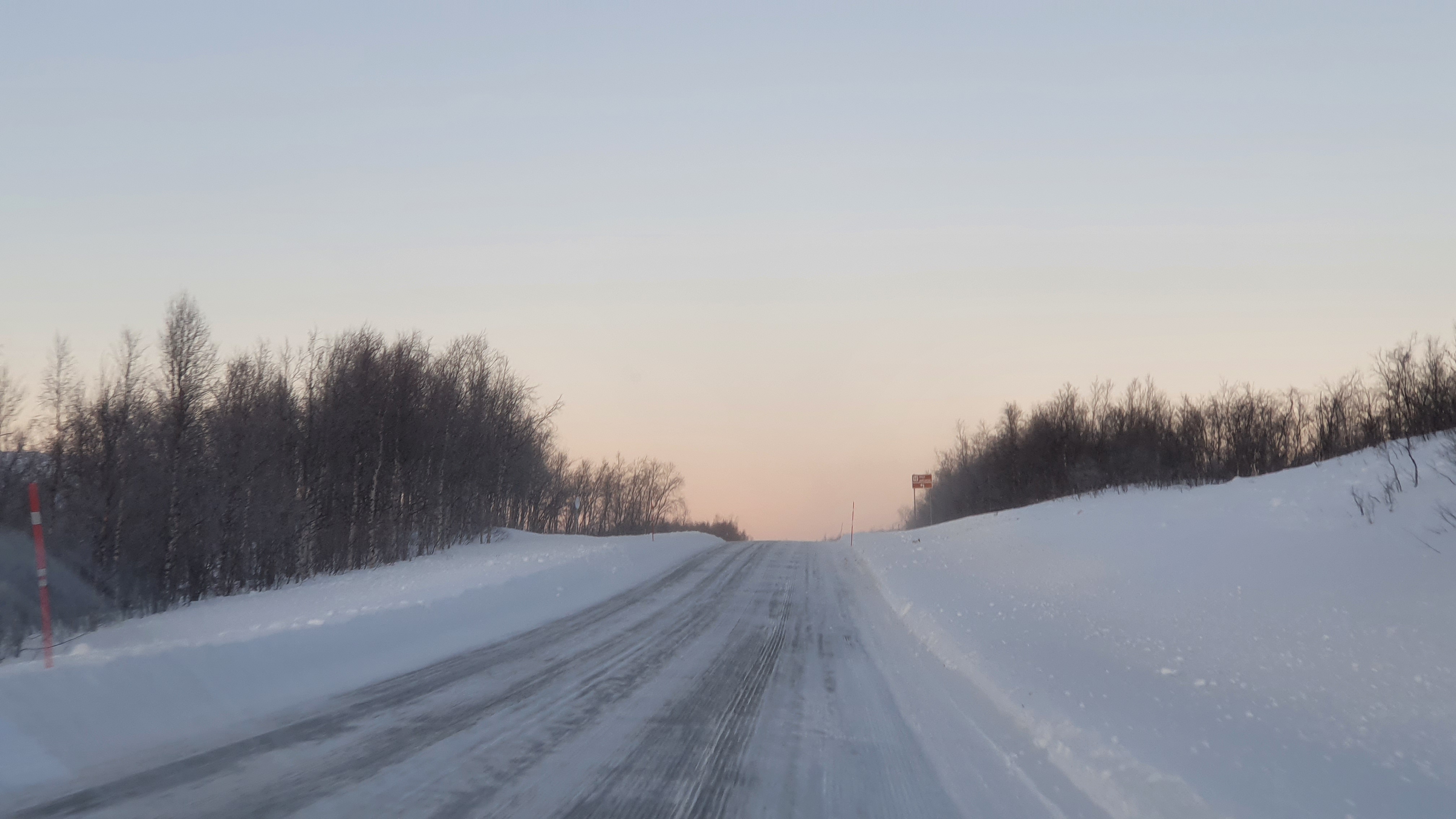 Reifen in Nordnorwegen scheinen meistens mit Spikes ausgestattet, denn die Straßen sind oft mit einer festen Eisdecke und einer darüber liegenden Schneedecke belegt. Unsere neuen Reifen waren sehr zuverlässig, die Schneeketten haben wir nicht benötigt.