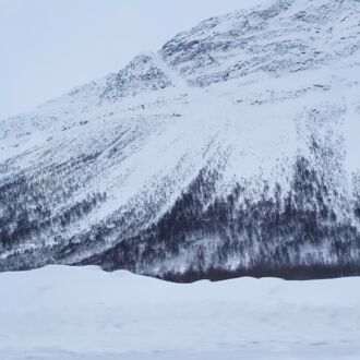 Nach einer kleinen Runde über ein Schneefeld und dem Blick über Tromsø inmitten der Fjordlandschaft treten wir den Heimweg an. Den Wind scheinen wir dabei mitzunehmen, die Schneeverwehungen türmen sich wieder und in der Ferne wirbeln kleine Schnee-Tornados über die Berge.