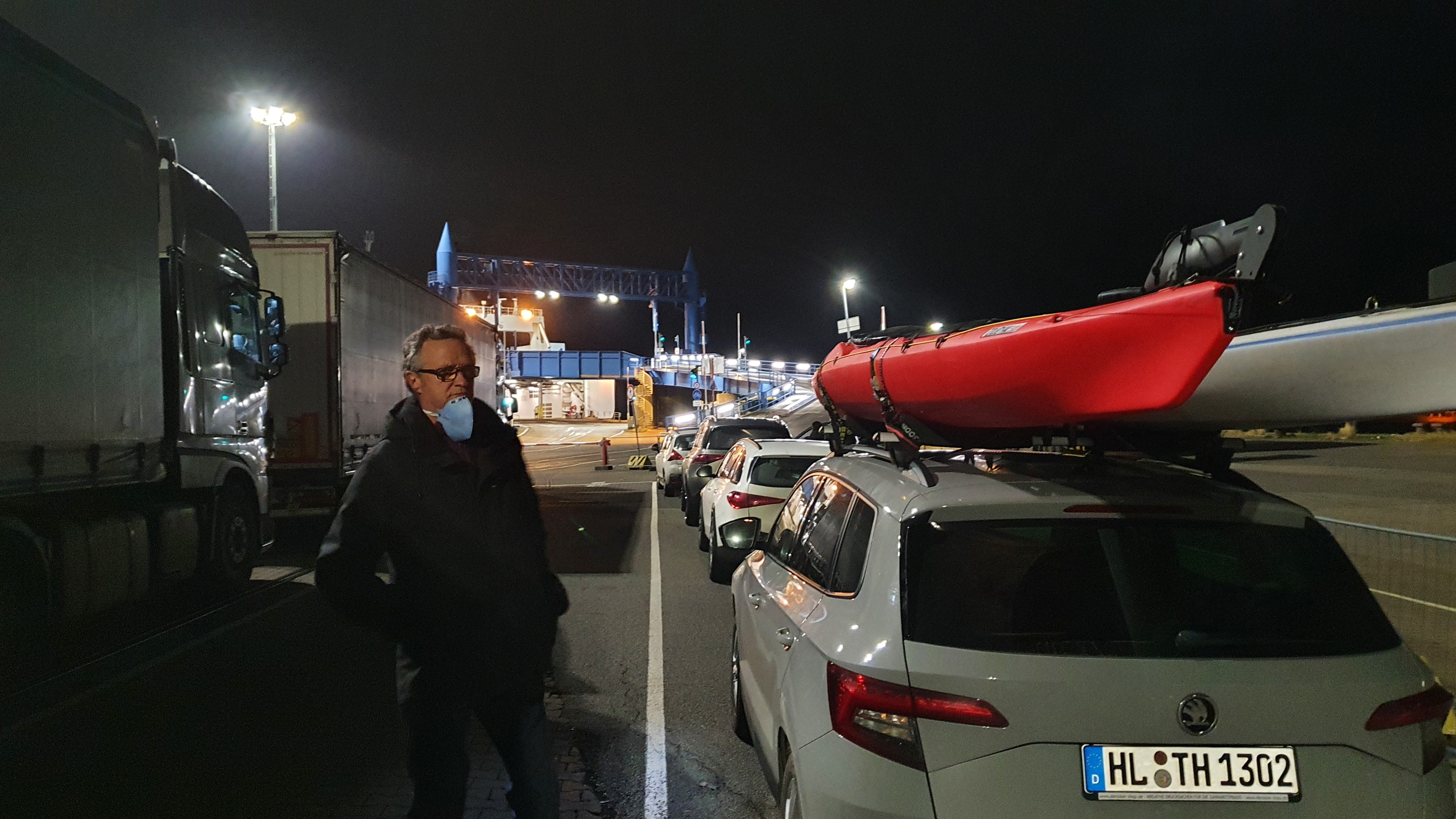 Nur fünf PKW stehen neben den vielen LKW in der Warteschlange vor der Nachtfähre Niels Holgersen. Gemeinsames Ziel: Trelleborg.