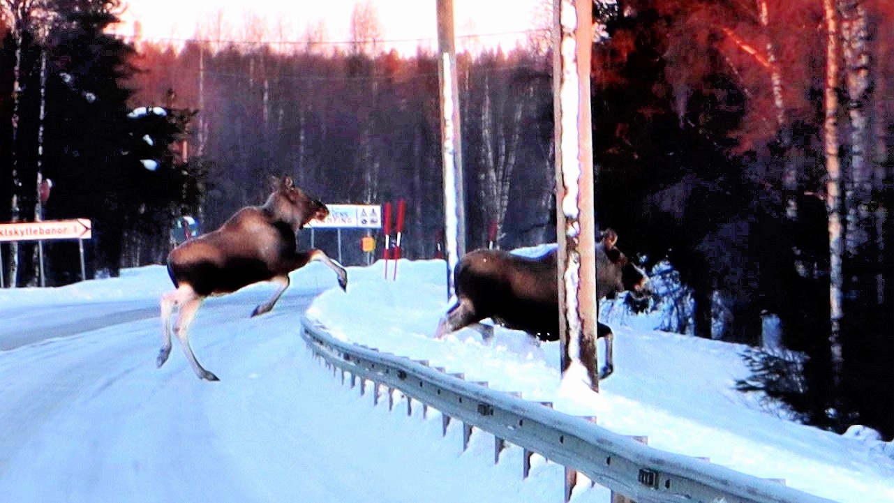 Selbstverständlich wird nun die Kamera herausgeholt. Aber ich habe sie noch gar nicht ganz ausgepackt, da stehen zwei weitere Elche am Straßenrand, äugen in unsere Richtung und überqueren eilig die Straße. Die Kamera war noch nicht richtig eingestellt…. Aber egal! Einfach nur toll und für uns beide erstmalig.