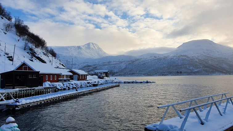 Unser Versuch, das Museum und Aquarium Polaria in Tromsø zu besuchen, scheitert. Der Streckenabschnitt, der durch die Berge führt, ist bis mindestens 12.00 Uhr gesperrt. Wir drehen um, ziehen uns wärmere Sachen an und laufen mit unserem Angelgeschirr zum Steg von Lauklines. Der Eigentümer der Ferienanlage hatte uns vor einigen Tagen erlaubt, von dort aus zu angeln.