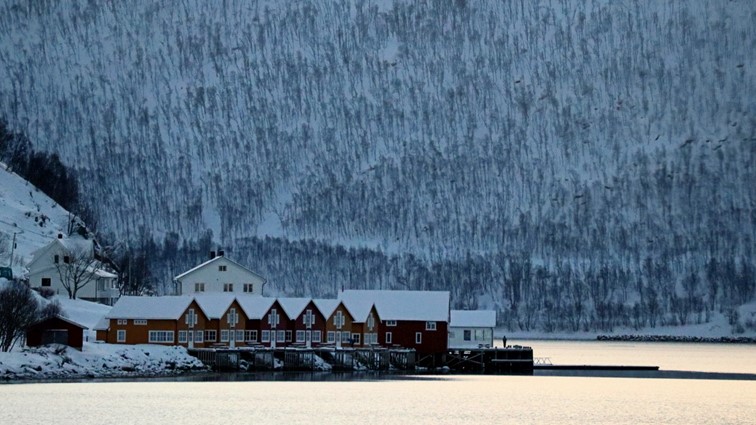 Rutschfeste warme Stiefel, warme Fäustlinge und Kajak-Lukendeckel müssen heute besorgt werden. Wegen des Lukendeckels machen wir im Vorort Eide halt, besorgen den Rest in Tromsø und schlendern erstmals durch die Einkaufspassage. Auffällig sind die Kombinationen von alter und neuer Architektur, schön auch der Blick auf einen Hang mit den bunten, typisch nordischen Häusern.