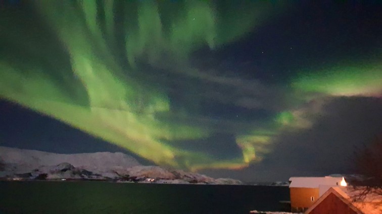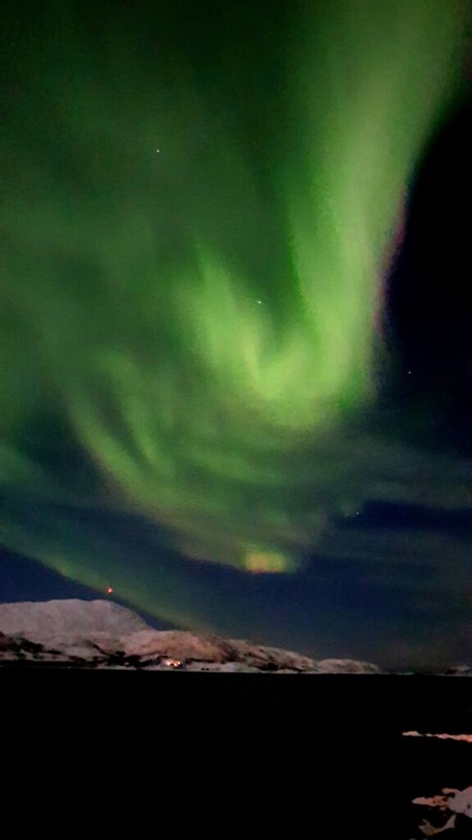 Gegen 18.00 Uhr entdeckt Fritz auf der Veranda Nordlichter. Sie tanzen am Horizont und über unseren Köpfen.